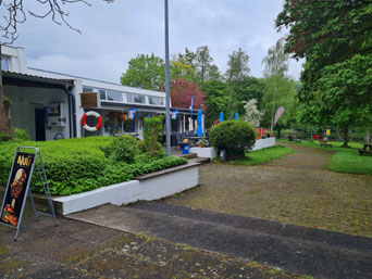 Ein Beachvolleyballfeld sowie Tischtennisplatten stehen